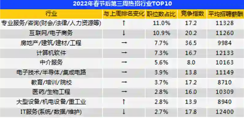 在此前统计的第二、三周的热招行业数据中,计算机软件类持平、IT服务类有略降。不过薪酬和竞争激烈度指数没有太大变化。