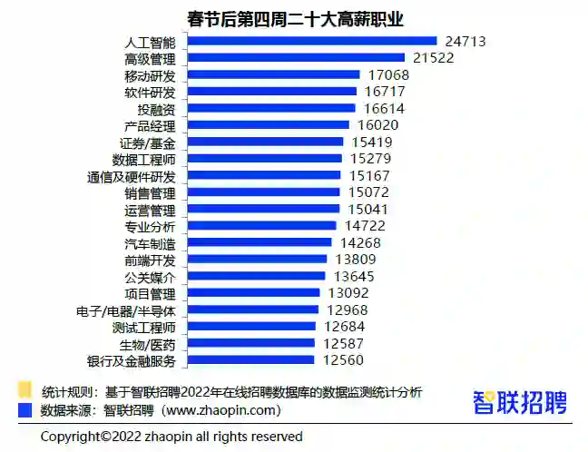 根据智联招聘的统计,人工智能岗位的平均工资连续提升,2022年春节后第三周的时候达到了23960元/月,第四周则进一步涨到24713元/月。