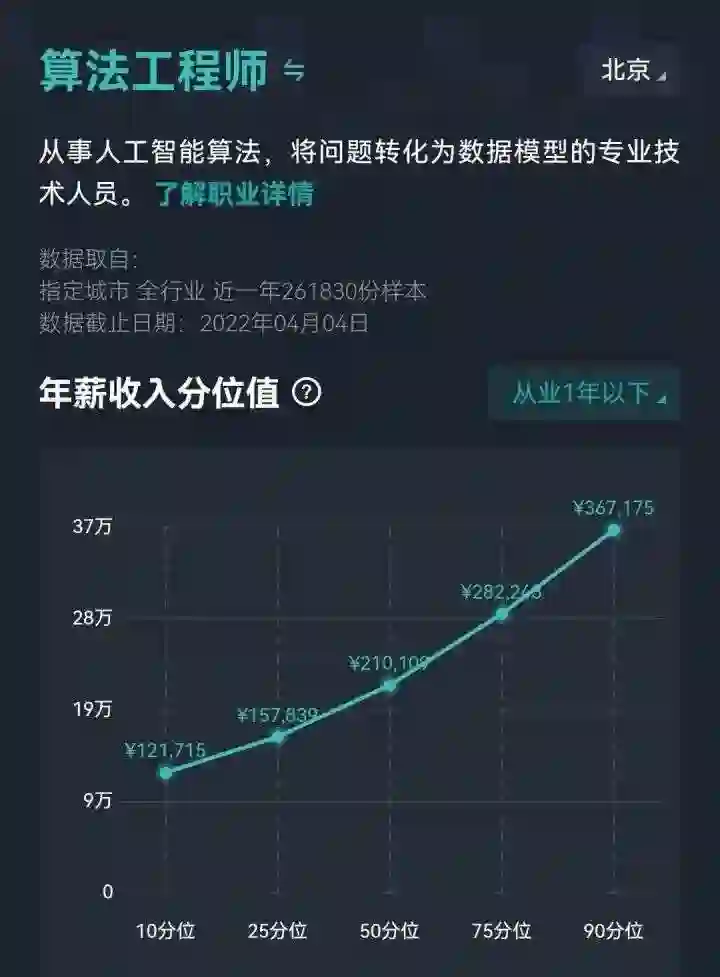 用户「僻露泠泠」直接把职场信息平台「看准」App里的可视化数据图扒拉来,可以看出即使月薪两万出头、年薪不到三十万的算法工程师,也在薪酬上赶超了四分之三的同行。