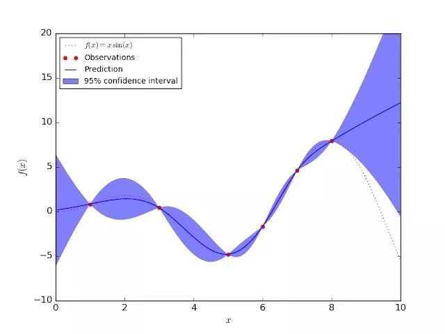 下图展示了一个在某个简单的一维数据集上的高斯过程回归模型。其置信区间反映了认知不确定性;训练数据的认知不确定性为零(红点)。随着我们离训练数据点的距离越远,模型应该给预测分布分配越高的标准差。不同于偶然事件不确定性,认知不确定性可以通过收集更多数据和「去除」模型缺乏知识的输入区域而降低。