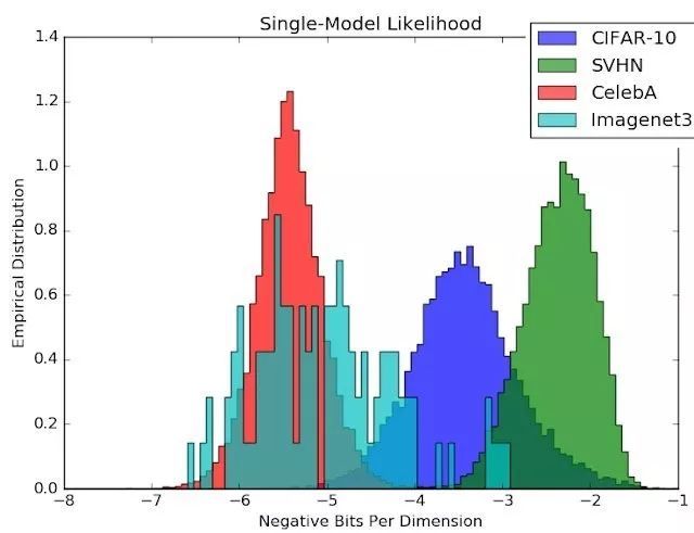 但我们不应该忘记这个似然模型也是一个函数近似器,可能存在自己的 OoD 错误!我们近期的生成式集成方法(Generative Ensembles,https://arxiv.org/abs/1810.01392,也可参阅 DeepMind 的同期研究 https://arxiv.org/abs/1810.09136)研究表明,在使用一个 CIFAR 似然模型时,来自 SVHN 的自然图像实际上比 CIFAR 分布内的图像本身还有更高的可能性!