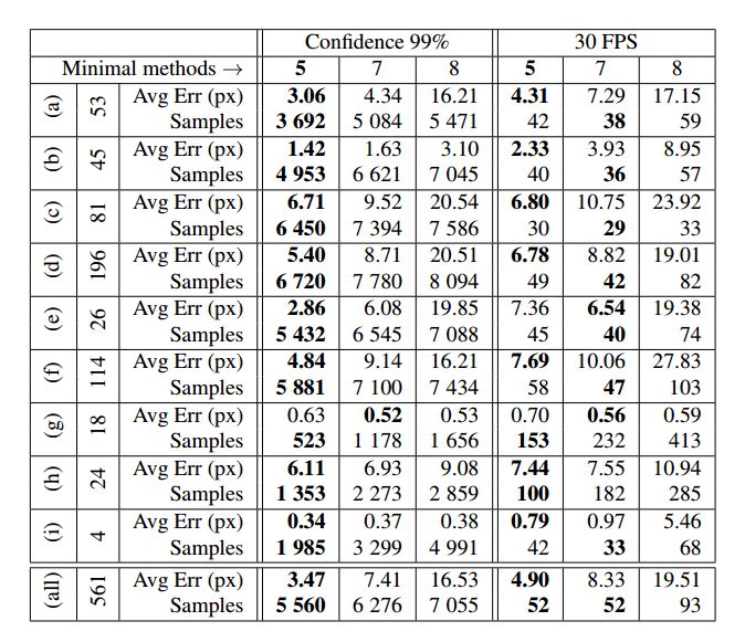 表3 基本矩阵估计(在Strecha数据集上使用GC-RANSAC和最小方法)
