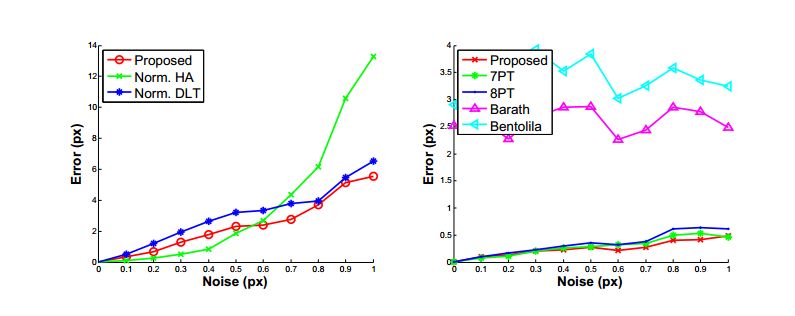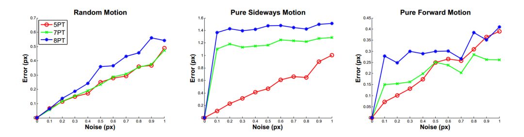 所提出的方法与一般运动的七点算法具有相似的精度。然而对于侧向运动,该方法对噪声的敏感性明显低于算法。对于前向运动,如果噪声σ不超过0.5,则五点算法最准确;σ超过0.5后,七点算法较优。