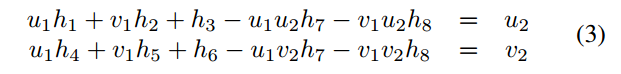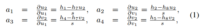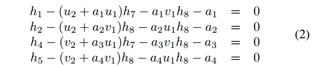 其中,ui和vi是第i个图像中的坐标(i∈{1,2}),hj是行优先的H矩阵中的第j个元素(j∈[1,9]),s = u1h7 + v1h8 + h9 是射影深度。