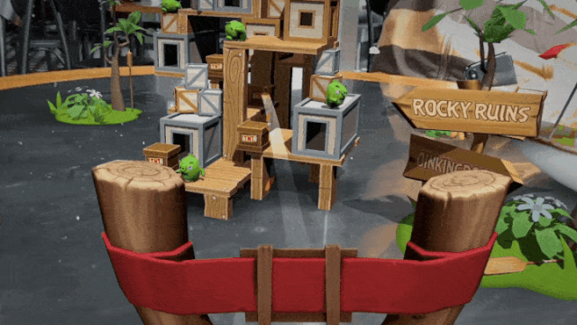 作为一款《愤怒的小鸟》系列的 AR 游戏,《愤怒的小鸟:猪之岛》几乎延续了该系列其他作品的玩法,你需要通过弹弓将技能不同的小鸟发射出去,并摧毁建筑物和站在上面的猪来通关。