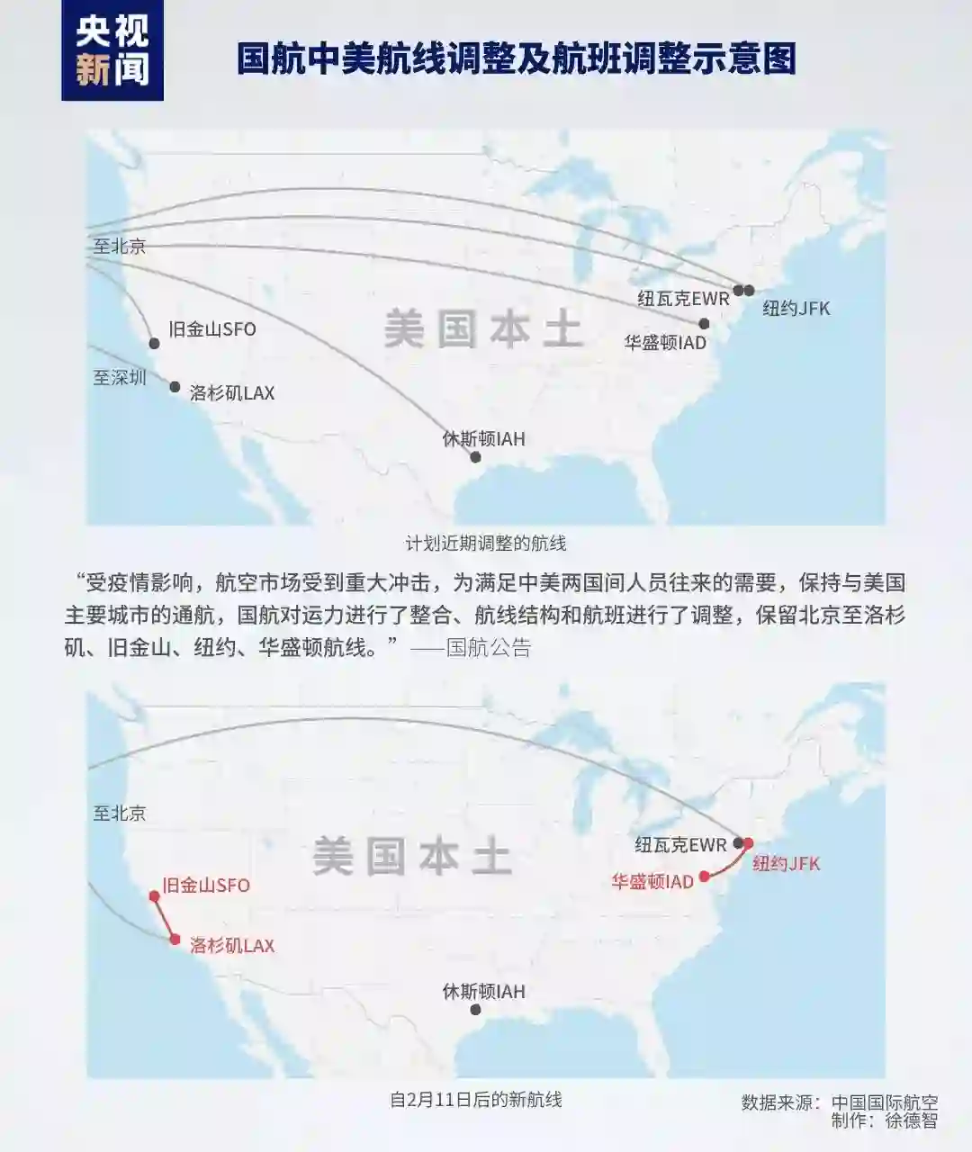 当地时间8日,中国国航发布中美航线结构及航班调整公告,公告称,虽受疫情影响,航空市场受到重大冲击,但为满足中美两国间人员往来的需要,保持与美国主要城市的通航,国航对运力进行了整合、航线结构和航班进行了调整,保留北京至洛杉矶、旧金山、纽约、华盛顿航线。中美航线航班如果有新的调整,国航将实时公布,旅客可通过国航官网、中国国航APP、国航服务热线95583或机票代理查询航班动态。(央视新闻)
