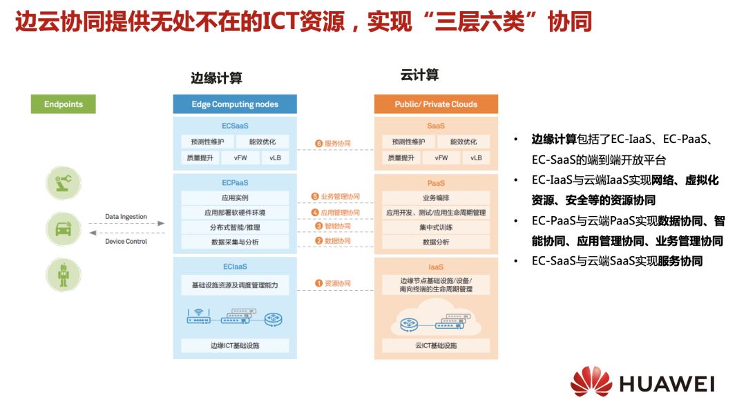 边缘计算与云计算需要紧密协同才能使能分布式智能。边云协同包括三个层次协同:云边IaaS协同,云边PaaS协同和云边SaaS协同,从而实现数据协同、网络协同、服务协同等六类协同。