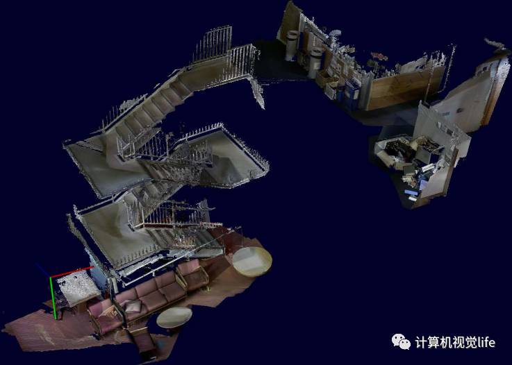 3D点云地图在VSLAM中用的比较多,主要用于真实场景的视觉重建,重建的地图非常直观漂亮。但是点云地图通常规模很大,比如一张VGA分辨率(640 x 480)的点云图像,就会产生30万个空间点,这会占据非常大的存储空间,而且存在很多冗余信息。
