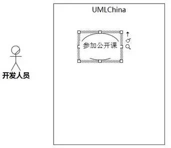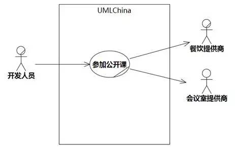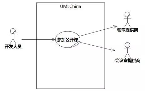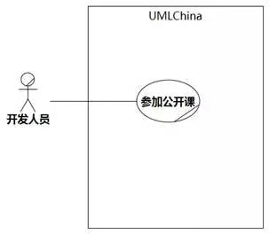 UMLChina业务系统改进的组织是UMLChina组织,第一个迭代周期只需要关注最值得改进的业务用例。根据愿景推测,参加公开课的流程最值得改进,业务用例图只需要先画出这个业务用例就够了。UMLChina组织当然还有很多别的用例,包括所有公司都逃不掉的用例——政府要向它征税,只不过改进纳税的流程离愿景比较远,所以我们不画出来,但不代表它不存在。