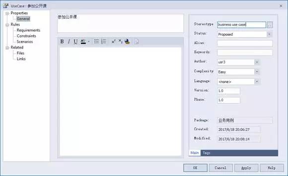 【步骤4】单击工具箱中的,单击边界框内,在文本框输入参加公开课。双击参加公开课用例,单击属性框Stereotype栏右侧的按钮,在Stereotype对话框选择business use case(也可以在属性框Stereotype栏直接输入business use case),单击OK,再单击OK。