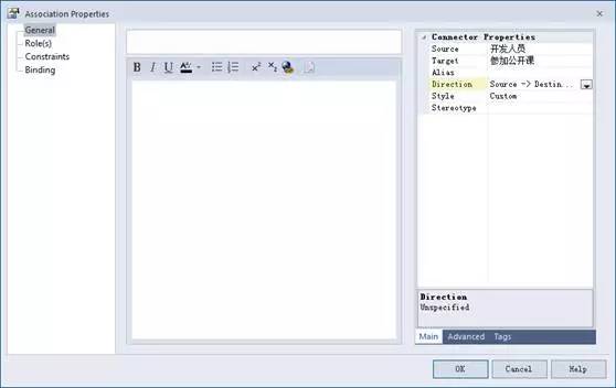 【步骤5】单击开发人员执行者,按住开发人员执行者右侧的小箭头(Quick Link),拖到参加公开课用例上,松开鼠标按键,从快捷菜单中选择Association。双击执行者和用例之间的关联线,在弹出属性框的Direction选择框中选择Source→Destination。