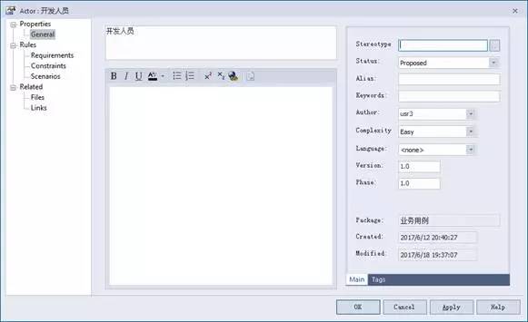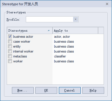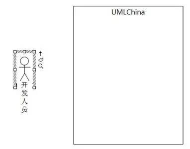 【步骤3】单击工具箱中的,单击边界框的左侧,在文本框输入开发人员。双击开发人员执行者,单击属性框Stereotype栏右侧的按钮,在Stereotype对话框选择business actor(也可以在属性框Stereotype栏直接输入business actor),单击OK,再单击OK。