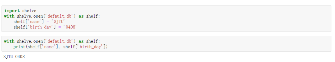 当使用关系数据库是一种浪费的时候,shelve 模块可以为 Python 对象提供一个简单的持久性存储选择。就像使用字典一样,通过关键字访问 shelf 对象。其值经过序列化,写入到由 dbm 创建和管理的数据库。