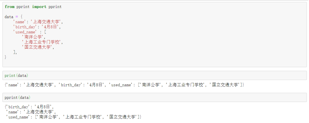 我们在使用python开发时,总是会使用print大法来debug。当处理更复杂的数据结构,例如嵌套字典,print的输出就会显得非常不规则,引起不适,这时候就需要pprint了。