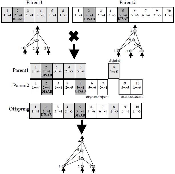 因为每个神经元和每个连接都是全局唯一的,所以有可能合并两个不同的网络,以产生一个新网络。这正是NEAT中的交配运算: