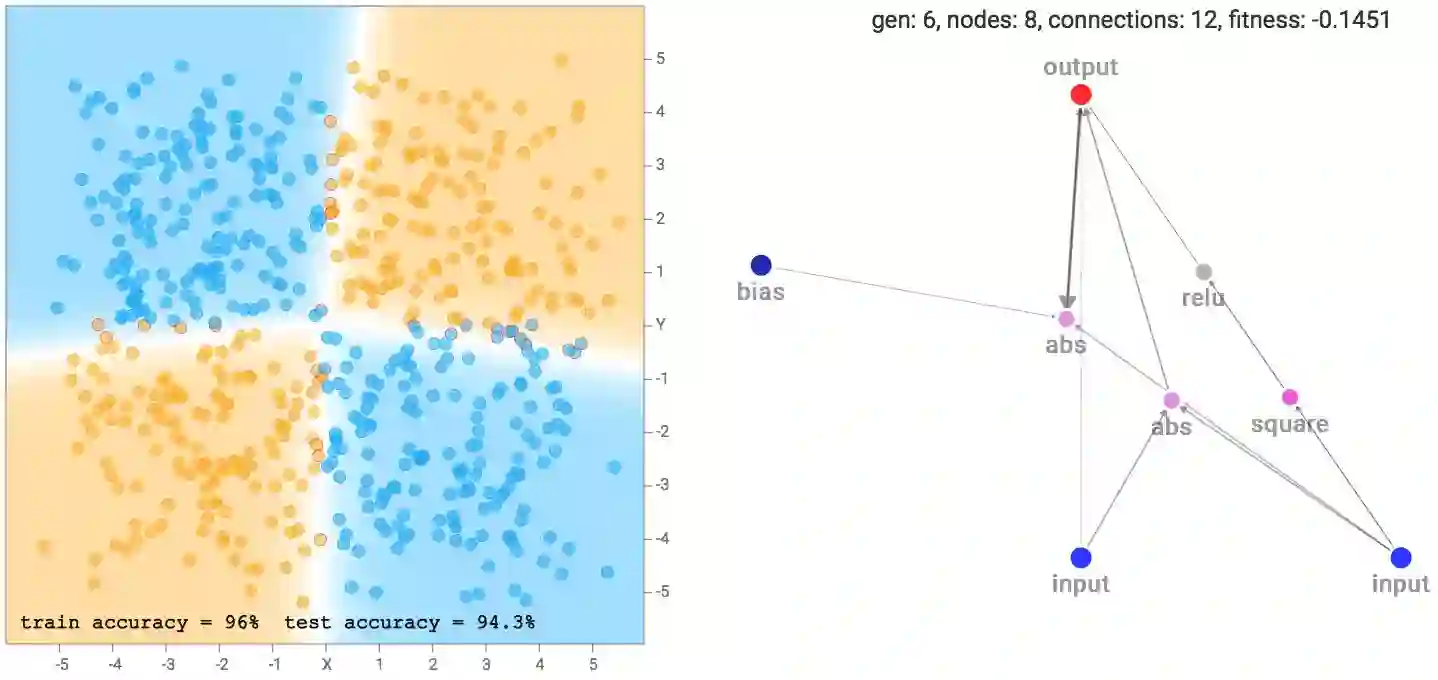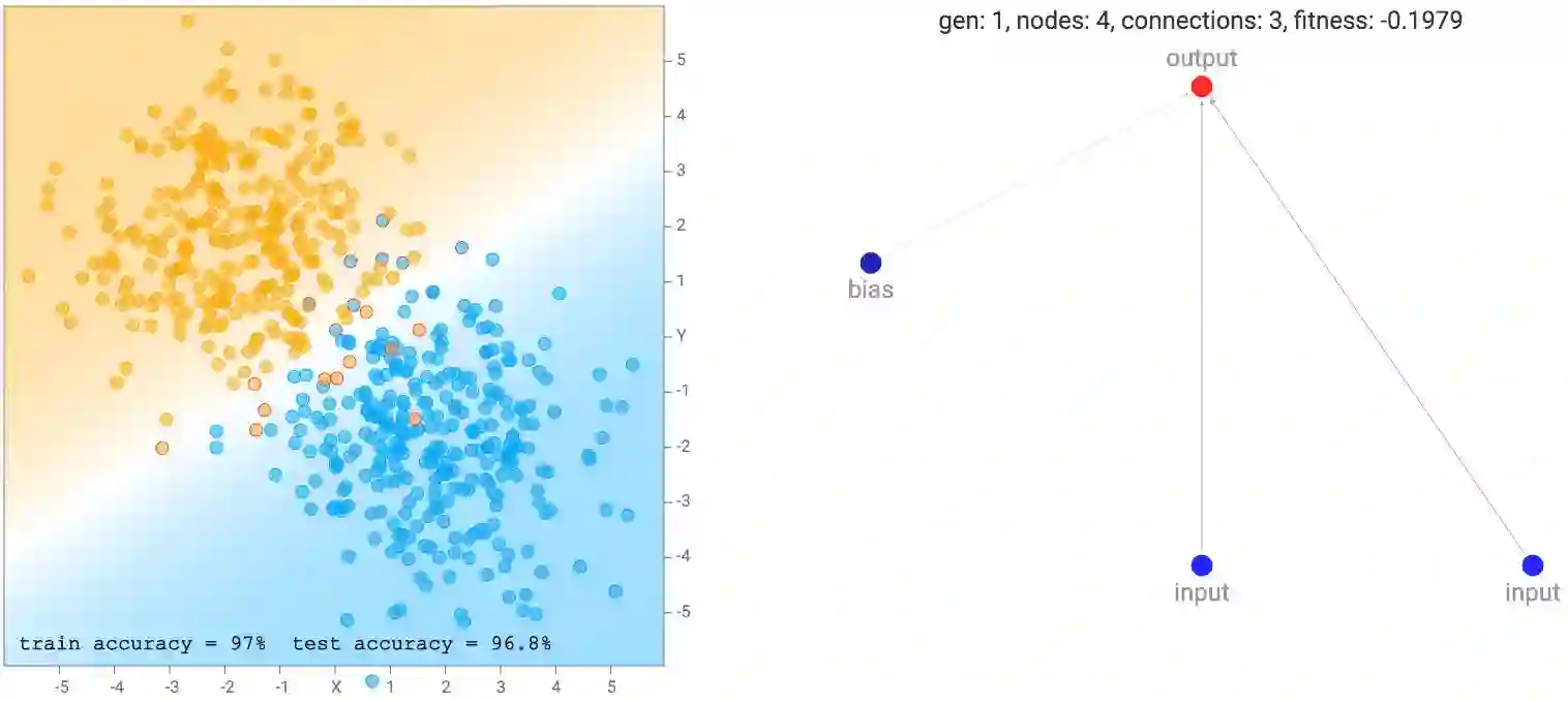 我认为神经演化是神经网络架构设计的重要工具。遗传算法不仅仅能够发现神经网络连接的权重,它也可以被扩展,用来发现整个神经网络。我认为使计算机能够自动发现新的神经网络架构是一个非常酷的想法,所以我创建了这个简单的demo来探索这个概念。