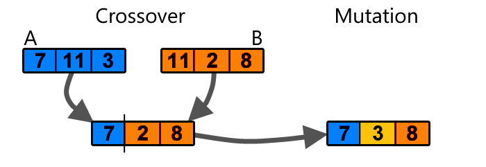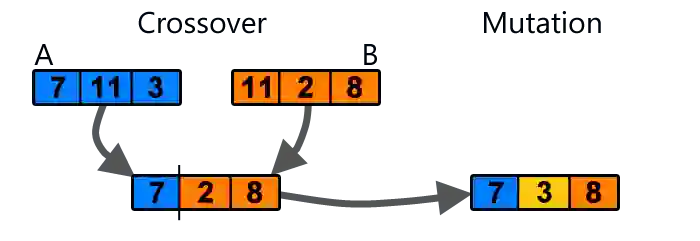 遗传算法离随机猜测仅有一步之遥。它的工作原理如下:想象一下,如果我们的神经网络有100个随机权重集合,我们评估对应每个权重集合的神经网络,看看它执行一定任务的表现。评估之后,我们只保留最佳的20个权重集合。我们将每组权重转换为一维数组。接着,我们可以从我们保存的20个集合中进行随机选择,取代剩余的80个权重集合,同时应用简单的交配和突变运算来构成新的权重集合: