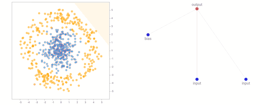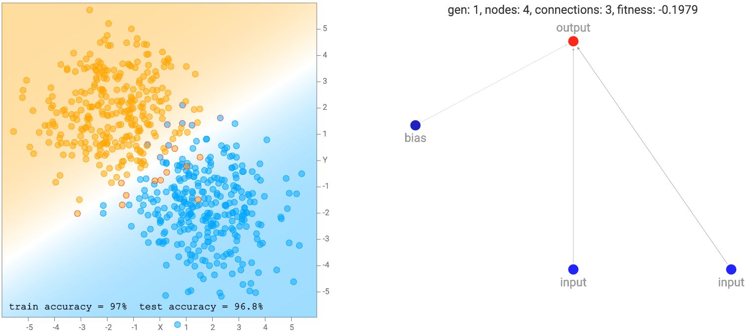 这个简单的网络只是将坐标线性组合成一个sigmoid层,sigmoid层不过是如上图所示,将平面划分成由一条线分开的两部分。输出接近于零的区域将被涂成橙色。接近于一的区域将被涂成蓝色,而零到一之间的区域将是两种颜色的混合,而位于0.5的区域将完全是白色的。我们看到,当数据集是两个高斯聚类时,最简单的默认网络已经表现得相当好了。实际上,刚开始由纯粹的随机权重构成的100个简单网络的初始种群,在应用任何反向传播或遗传算法之前,种群中的最佳网络对于这种类型的数据集而言已经足够好了。