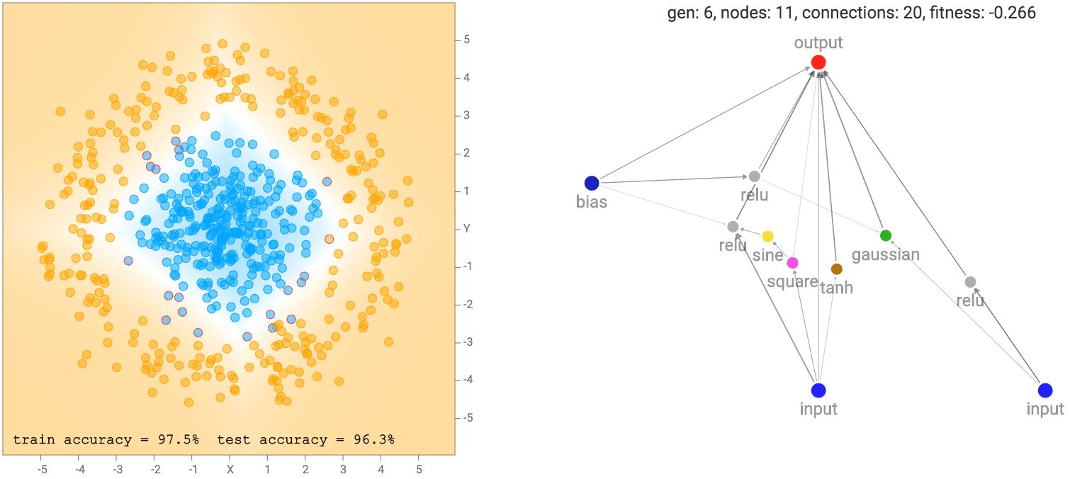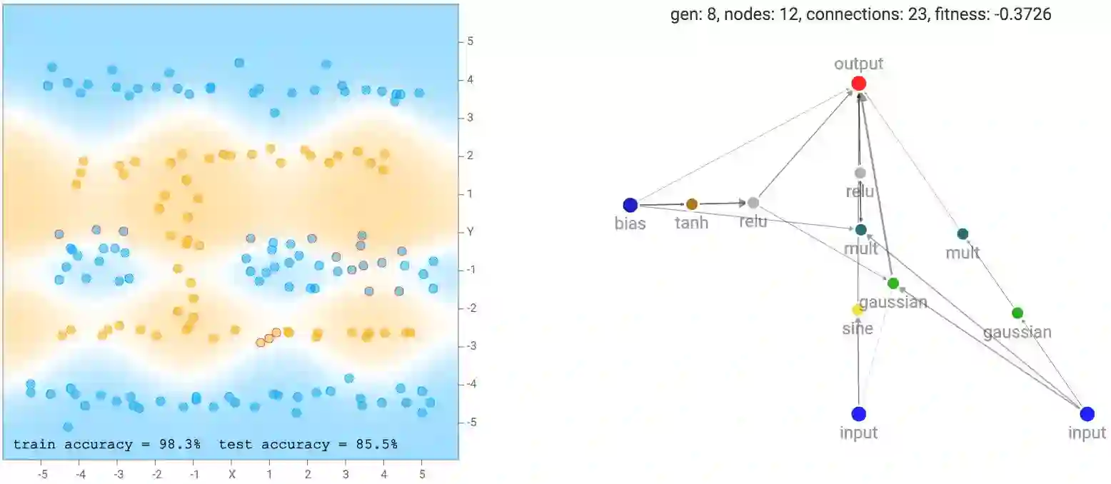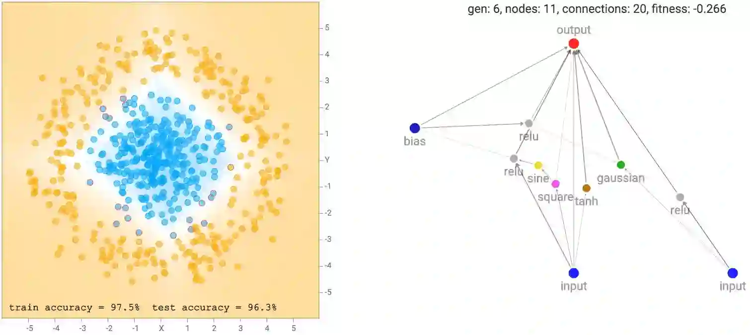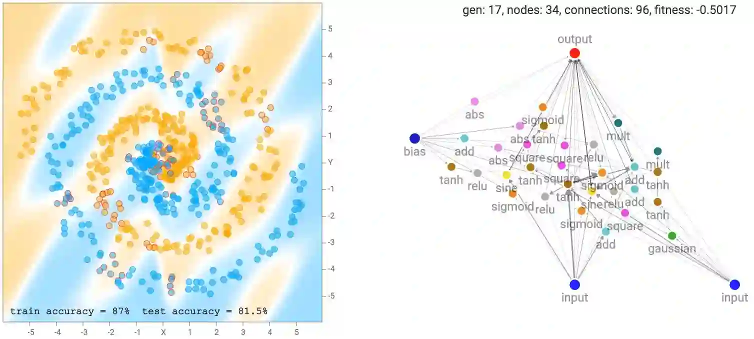 编者按:Google Brain的hardmaru创造了一个demo,使用遗传算法以生成高效而不同寻常的神经网络结构,分类TensorFlow Playground中的数据集。你可以亲自尝试这个demo的效果,地址:http://otoro.net/ml/neat-playground/。
