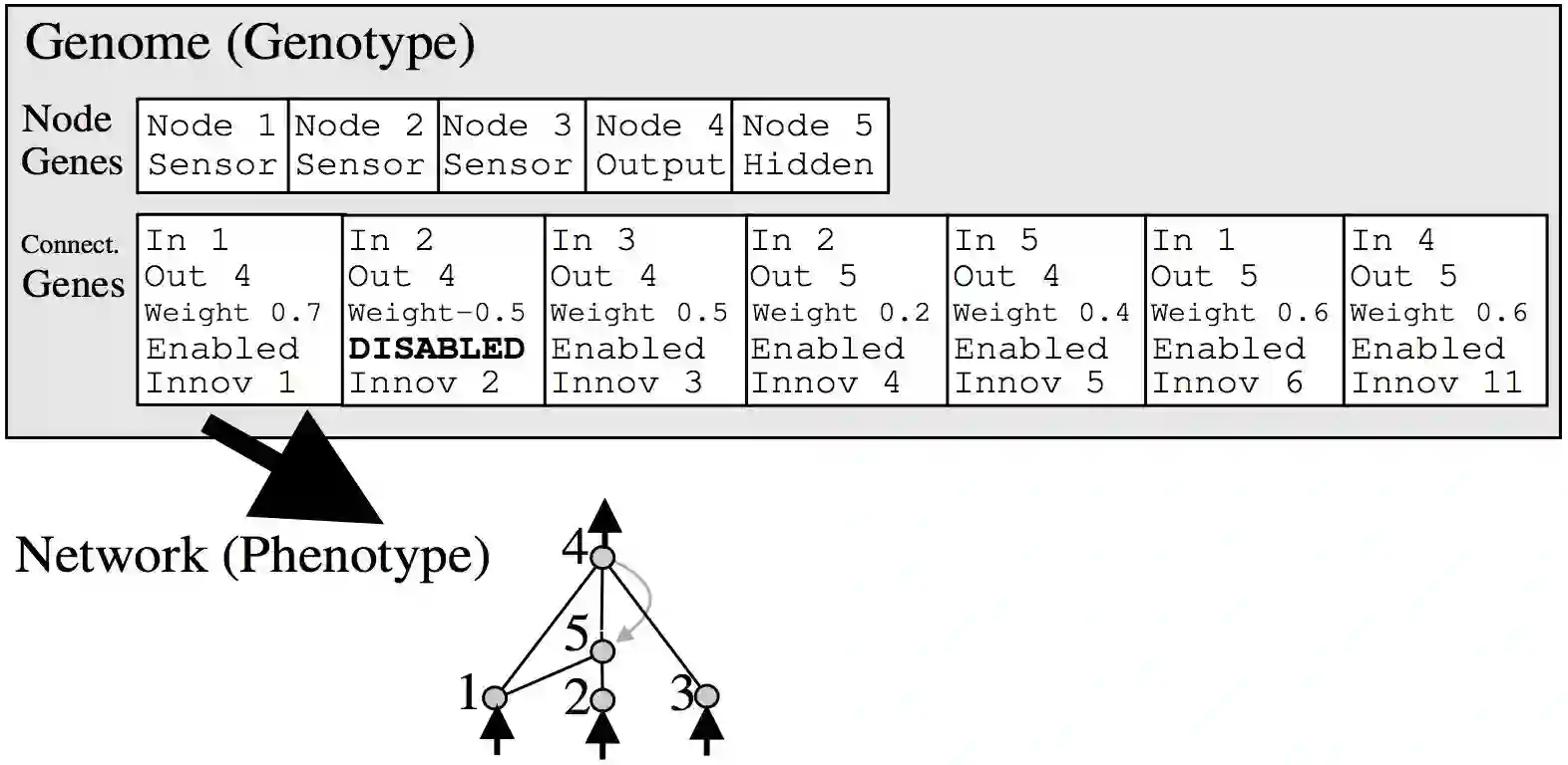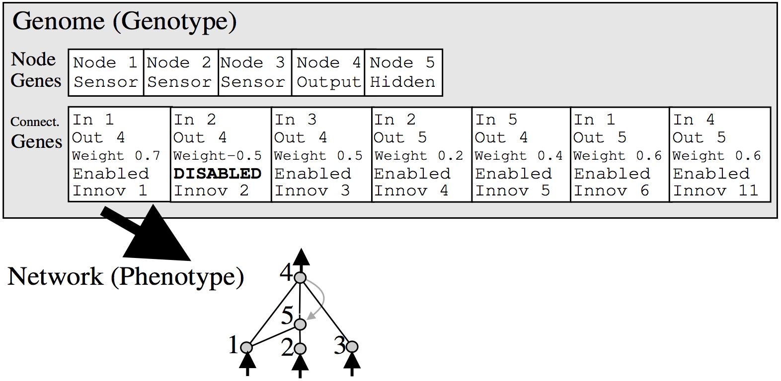 增强拓扑神经演化(Neuroevolution of Augmenting Topologies,NEAT) 是一种基于遗传算法演化新型神经网络的方法。它是Ken Stanley十多年前发表的,流行于关注演化计算的AI研究人员的非主流小社区。在深度学习占统治地位的主流机器学习研究中,演化计算当然不流行。深度学习的研究人员像是AI社区的流行乐偶像,而非主流研究人员更像是一些没有人听说过的晦涩难懂的车库独立金属乐队。