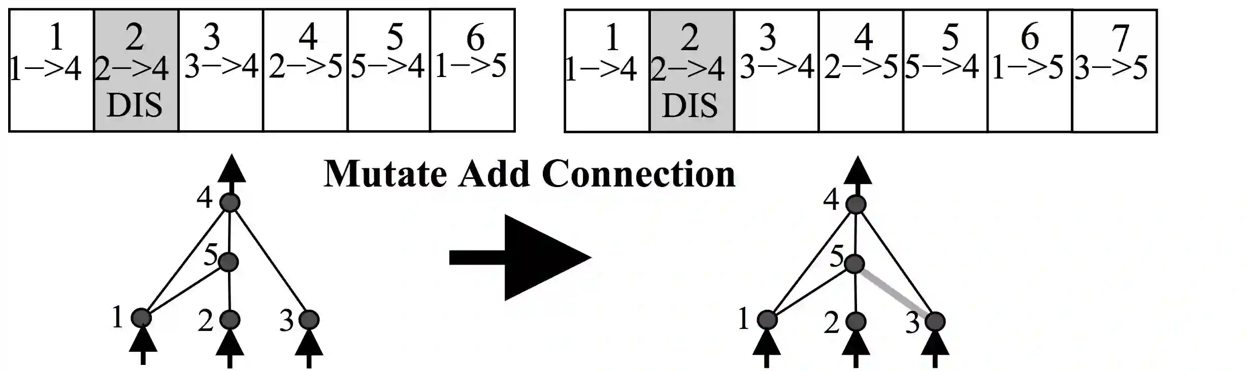 同时也有一定的概率,在一次突变运算中会创建一个新的连接,如下所示: