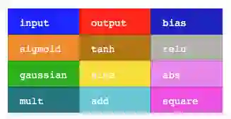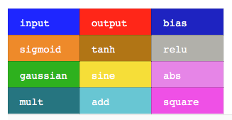 在我们的NEAT实现中,我允许使用许多种类的激活函数,这些激活函数在神经网络中以不同颜色表示: