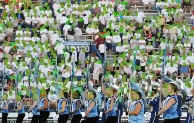 WIDER FACE人脸图像示例 - 绿框为腾讯AI Lab检测结果,红框为官方标注结果。