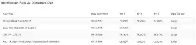 在人脸识别领域,MegaFace是目前最权威热门的人脸识别评测平台之一,由美国华盛顿大学(University of Washington)发布维护,在百万规模人脸数据下,评定1:N辨识(Face Identification)和1:1验证(Face Verification)两大指标准确率。前者是在N个人数据库中找到1个目标人脸,后者是判断给定的两张人脸是否属于同一身份。基于评测数据规模和评测指标上的优势,MegaFace吸引了Google、俄罗斯著名安防公司Vocord、日本NEC和美国卡耐基梅隆大学等知名机构参与。