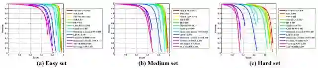 WIDER FACE评测结果曲线,第一行是验证集结果,第二行是测试集结果。详情见如下链接: