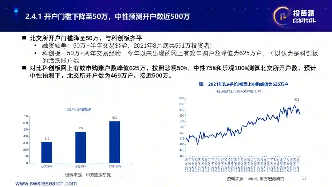 这个时点发生在什么时候?我们判断应该是在2022年的下半年左右的时间。为什么?因为北交所的建立是在2021年的11月15号正式开市,开市完之后会有很多公司想要挂牌过来,以及有些公司从基础层要到2022年的5月份调到创新层之后,再去申报北交所,所以大量好的公司可能会在明年的五六月份,披露完年报之后,立马奔向北交所。