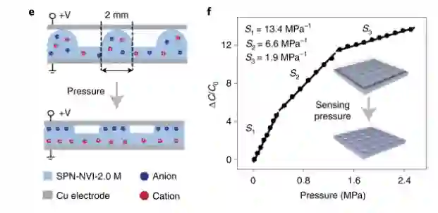 为了突出该材料在生物电子领域的应用,研究人员制作了一个基于水凝胶的电容式压力传感器,并且将 SPNs 的表面做成半球形形结构以提高材料的灵敏度。