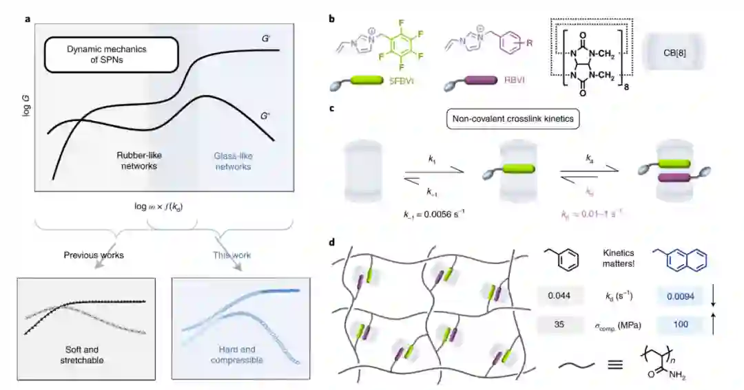 图|玻璃状SPNs的设计。a.SPNs的动态机制示意图(上);b.全氟苯基(5FBVI)、取代苯基(RBVI)客体和宿主大环的分子结构;c.包括第一和第二缔合的主体增强极性π-π相互作用的三元络合平衡及其相关动力学参数;d.由上述相互作用和两个RBVI客体交联的超分子聚丙烯酰胺网络表现出缓慢的解离动力学和高抗压强度。(来源:该论文)