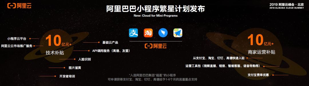 3月21日,在2019阿里云峰会·北京上,阿里巴巴旗下的阿里云、支付宝、淘宝、钉钉、高德等联合发布“阿里巴巴小程序繁星计划”:提供20亿元补贴,扶持200万+小程序开发者、100万+商家。凡入选“超星”的小程序,入驻支付宝、淘宝、钉钉、高德后还能得到流量重点支持。