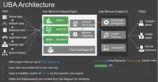 我们需要分析的源文件通常表现为多种数据类型,例如服务器数据、网络数据、数据库数据、应用程序数据、安全数据等。传统的用户行为分析系统通常以离线批处理模式根据既定规则对这些数据进行分析。而如今的最新趋势则倾向于添加某种形式的机器学习方案,从而利用在线 / 流式处理,对实时数据进行分析以区分威胁行为与正常行为。