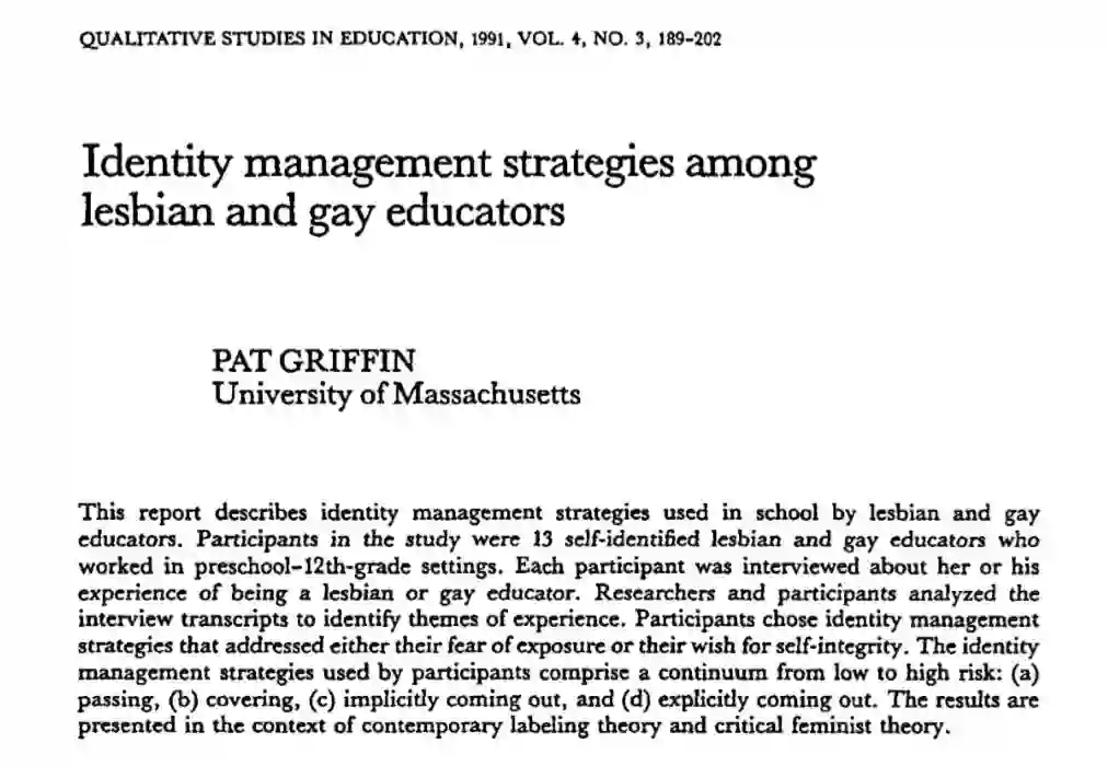 Griffin,P. (1991). Identity Management Strategies among Lesbian and Gay Educators. International Journal of Qualitative Studies in Education, 4(3), 189-202.
