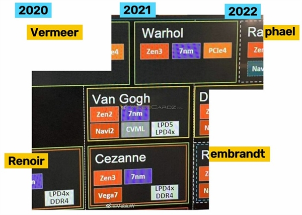 据外媒WCCFTech最新报道称,作为Vermeer继任者的Zen 3 Warhol或于2021年到来,而Zen 4 Raphael则定于2022年面世。AMD泄露路线图揭示了从2020到2022年的锐龙CPU和APU产品线的规划,分别是2021/2022年的Warhol Zen 3和Raphael Zen 4处理器(采用AM5接口),以及定于2021下半年到来的 Rembrandt APU 。
