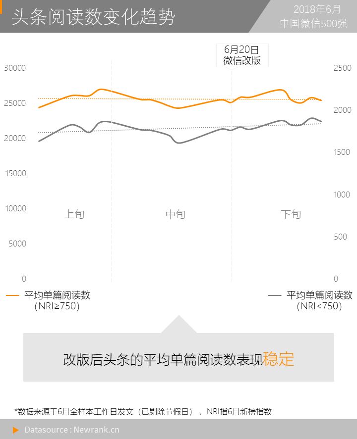 此次改版实际带来了多大的影响呢?新榜选取6月291109个活跃账号的15476577篇推文作为观察对象,同时为避免周末及节假日期间数据波动对研究结果产生的影响,将周末及端午节的数据做剔除处理,进而分析公众号工作日运营数据的变化。