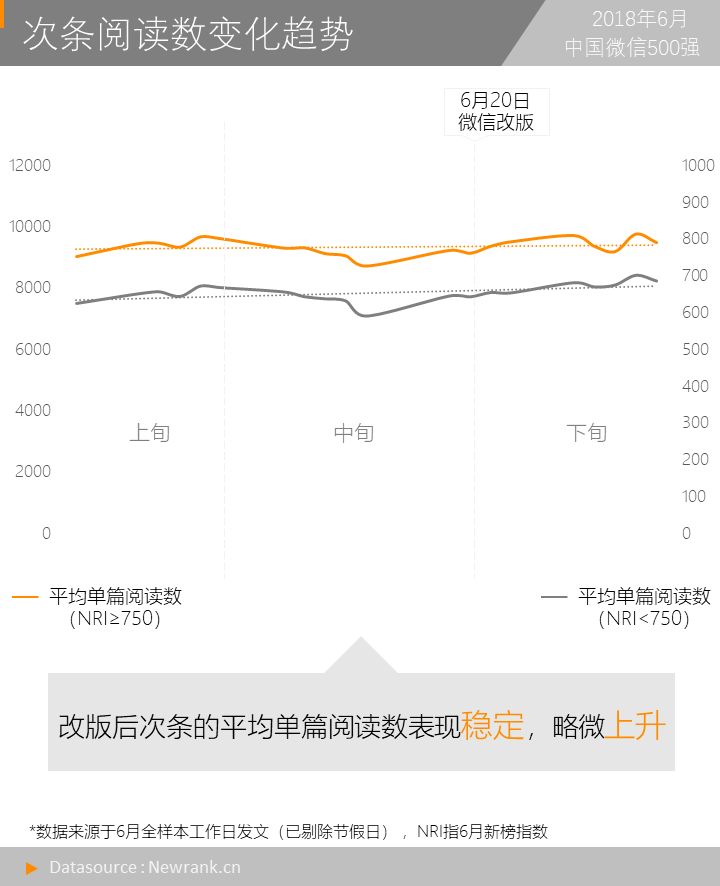 针对次条内容的阅读数,从整体趋势来看,750分及以上账号和750分以下账号在改版后均有一定程度的上升。对比发现,在6月20日改版后,750分及以上账号增幅为1.7%,750分以下账号增幅较大,为4.3%。再次验证上文观点,中长尾账号或因此受益。