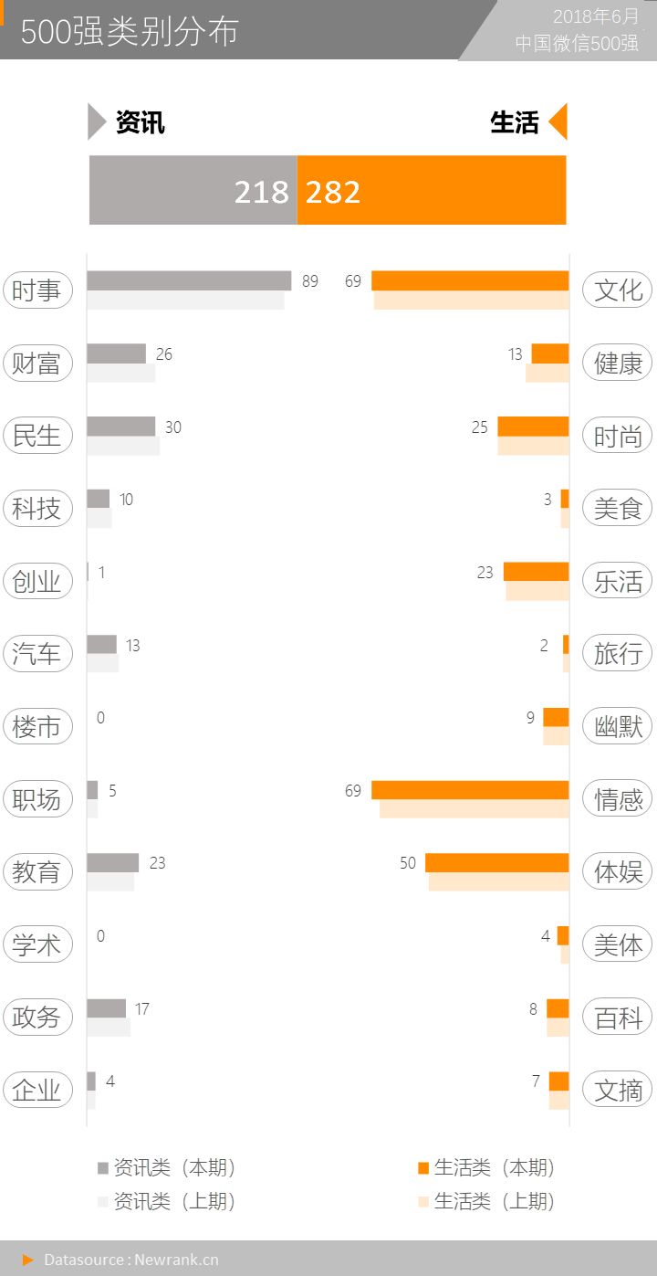 时事(89)、文化(69)、情感(69)、体娱(50)与民生(30)是6月500强中所占席位最多的类别位次。上述五强类别占据500强席位的61.4%。资讯与生活类账号的比例为1:1.3,差距进一步拉大。