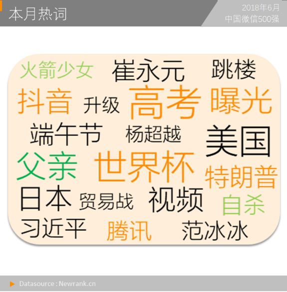 六月端午节、父亲节为可预期的常规热点;中美贸易战升级持续引关注;崔永元炮轰范冰冰、升学中高考、俄罗斯世界杯、甘肃19岁少女跳楼自杀及火箭少女11人成团,亦属热点之列。
