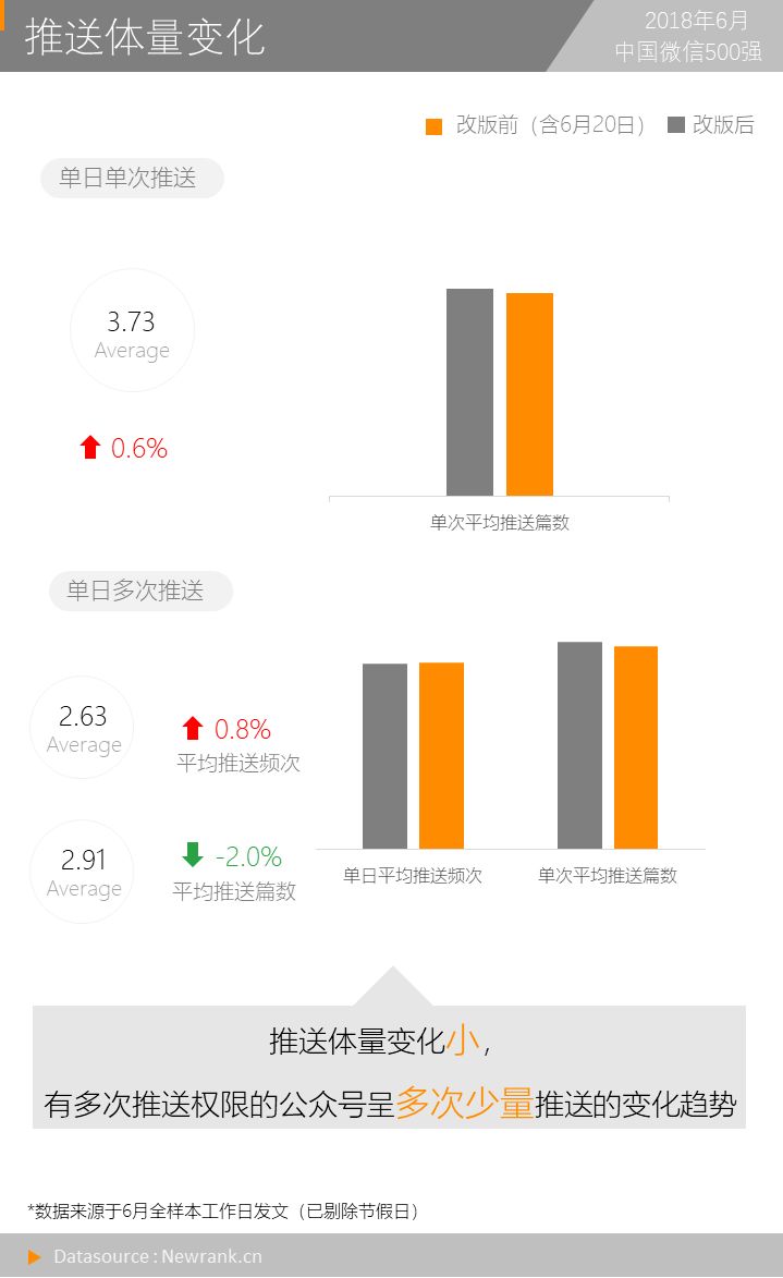 一般而言,订阅号每天只能推送一次消息,每次推送至多可至8条。但部分早期运营的公众号或者媒体机构类公众号有多次推送的权限。新榜针对单次推送的账号和多次推送的账号分开统计其推送体量,发现3-8条被折叠后,账号的推送体量并未发生明显变化,拥有多次推送权限的账号倾向使用权限进行多次少量的推送。