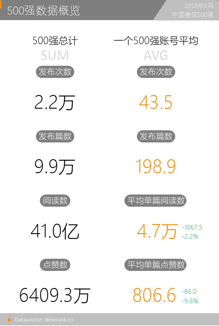 以公众号个体而言,1个500强账号日均发布1.45次,每次发布4.6篇,每篇收获47280次阅读(环比下降2.2%)和806.6次点赞(环比下降9.6%),平均每58.3次阅读贡献1个赞。继5月单篇内容的点赞数出现下降趋势后,本月降幅增加,由892.7次降至806.6次。