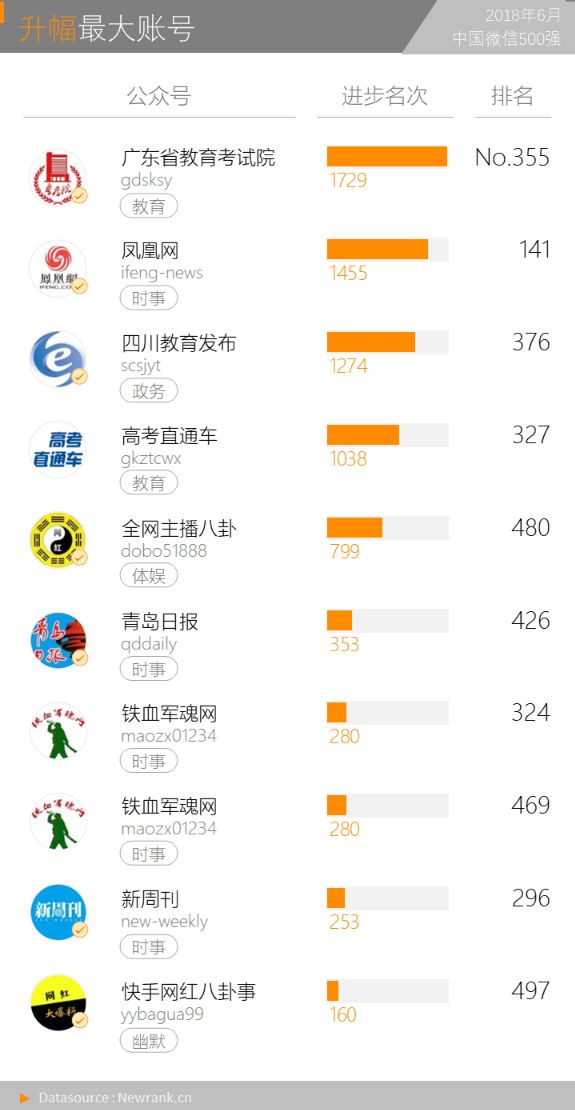 6月恰逢考试季,教育类账号“广东省教育考试院”平均阅读数较上月增加34734次,上升1729位,获升幅榜冠军。同样因此受益的还有 “四川教育发布”及“高考直通车”,分别上升1274位和1038位,为升幅榜的第三、四席。