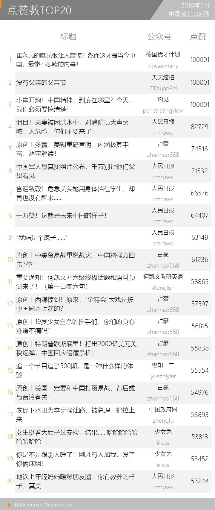 本月点赞十万加的内容共计3篇:“德国优才计划”推送的《崔永元的曝光很让人震惊?然而这才是当今中国,最惨不忍睹的内幕!》,该内容因违规目前已无法查看;“天天炫拍”于6月16日父亲节前一天推送的《没有父亲的父亲节》;“灼见”发布的《小崔开炮!中国精神,到底在哪里?今天,我们必须要搞清楚!》,以“崔永元炮轰范冰冰”事件为切入点,追寻中国精神,激发爱国热情。