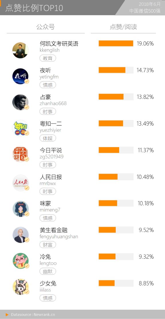 一直蝉联桂冠的“夜听”,本月点赞比例下降10.1%,至14.7%,不敌文末持续引导用户点赞的“何凯文考研英语”;“占豪”环比下降3.7%,依旧收获季军。点赞比例三甲降幅明显。 “少女兔”替代“紫竹张先生”跻身十强末位。