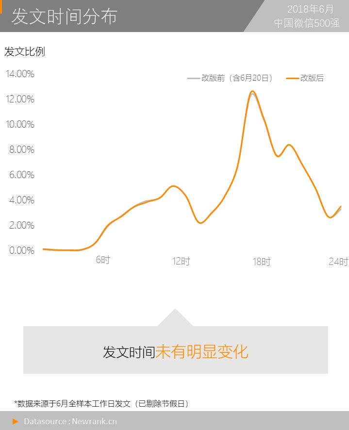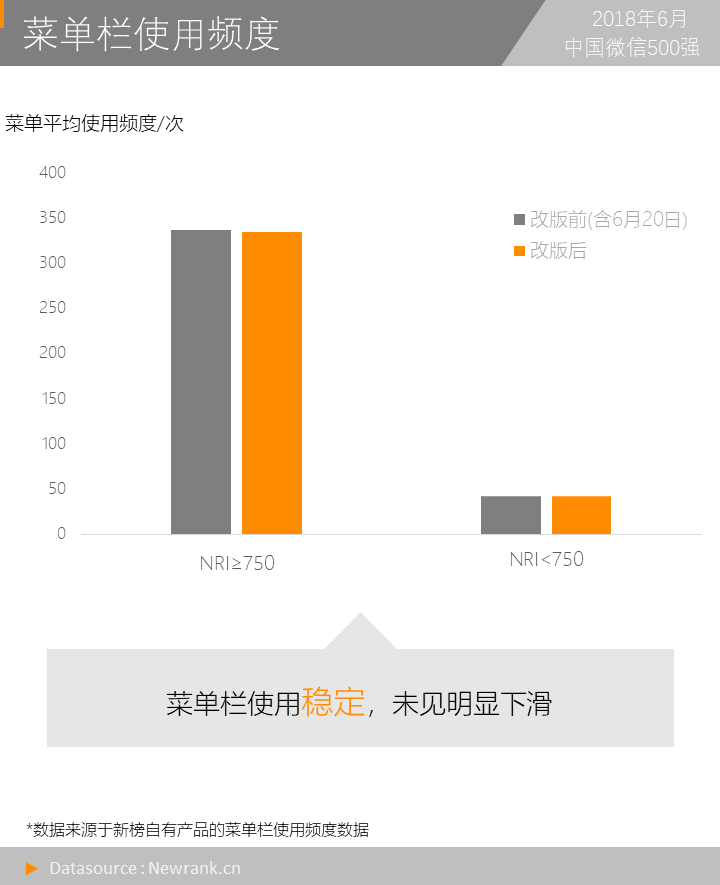 微信改版后,头次条阅读数稳中有升,3-8条阅读数略微下降,菜单栏使用未见明显降幅,推文时间未受影响。