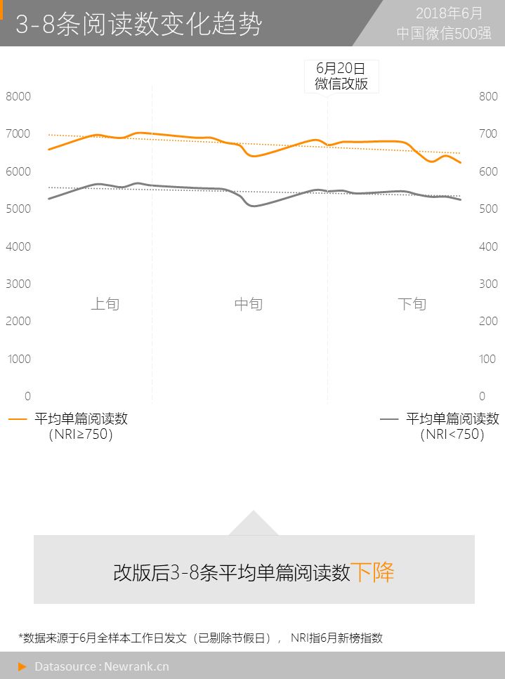 改版后,推文呈现为“标题+封面图”的形式且只展示头次条,两条以后的推文折叠,需手动展开进行阅读,从产品设计上强化了头次条而弱化了3-8条。依据6月新榜指数,将全样本划分为750分及以上(NRI≥750)和750分以下(NRI<750)两类别,同时将6月划分成上、中、下旬三个统计区间,对6月工作日的推送内容进行研究。数据表示,改版后头次条的单篇阅读数整体出现略微增长且750分以下(NRI<750)的账号增幅更大。对于大家担忧的二条以后的流量问题,数据显示,3-8条的单篇阅读数有所下降,但没有出现大幅下滑,其中750分以上的账号降幅较为明显。