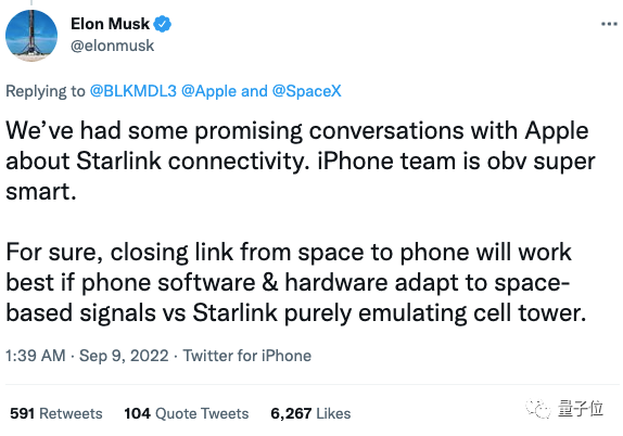 就在苹果发布会上iPhone公布了自家「捅破天」技术后,马斯克随即发推,据他称,自己及SpaceX已与苹果团队讨论过iPhone接入星链的可能性。