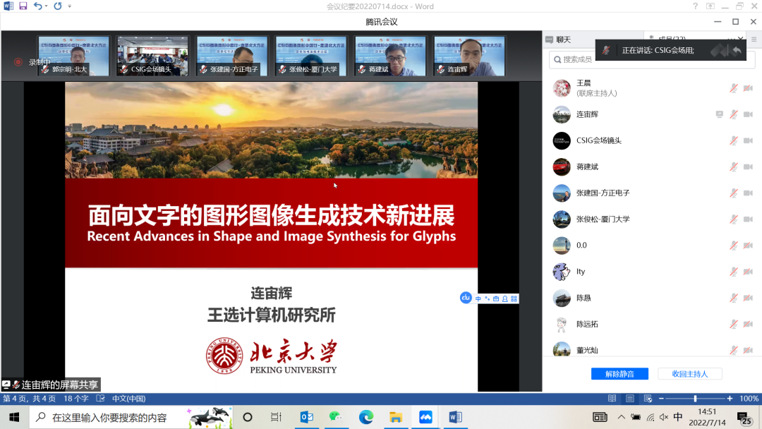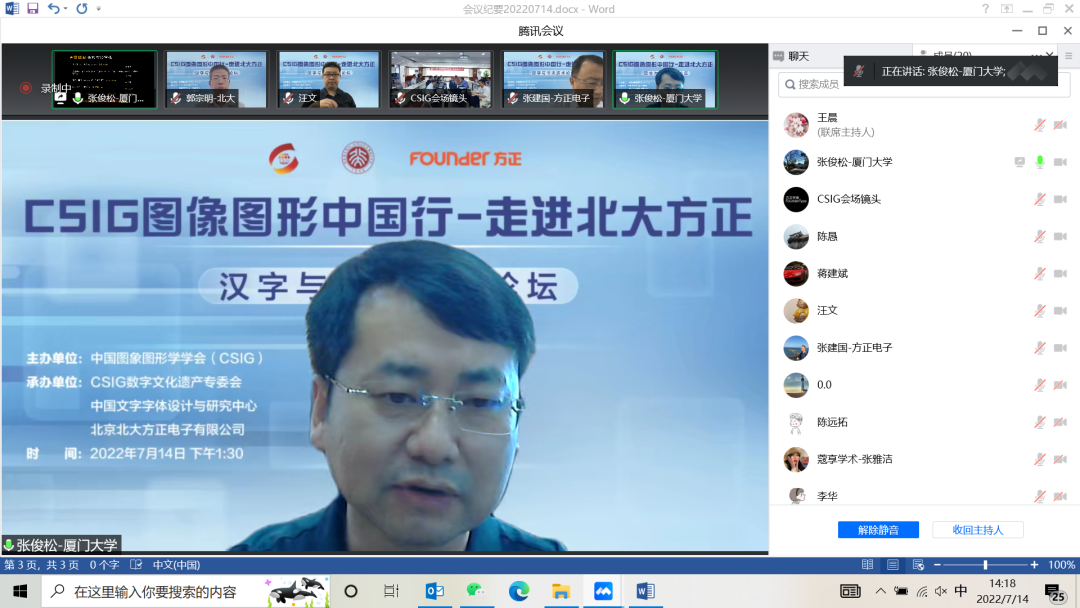 2022年7月14日,由中国图象图形学学会(CSIG)主办,CSIG数字文化遗产专委会与中国文字字体设计与研究中心(简称“字体中心”)、北京北大方正电子有限公司(简称“方正电子”)联合承办的“CSIG 图像图形中国行-走进北大方正”学术活动在北京上地方正大厦召开。