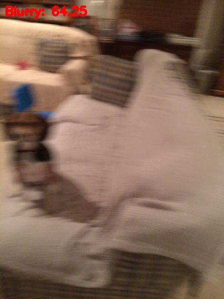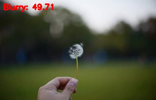 def variance_of_laplacian(image):# 对图像进行拉普拉斯变换,并返回拉普拉斯的方差return cv2.Laplacian(image, cv2.CV_64F).var()# 设置需要输入的参数,-i 输入图像的路径(文件夹名), -t 设置阈值的大小ap = argparse.ArgumentParser()ap.add_argument("-i", "--images", required=True,help="path to input directory of images")ap.add_argument("-t", "--threshold", type=float, default=100.0,help="focus measures that fall below this value will be considered 'blurry'")args = vars(ap.parse_args())# 循环输入图片for imagePath in paths.list_images(args["images"]):# 导入图像并转换为灰度图,计算我们关注的拉普拉斯变换后的方差image = cv2.imread(imagePath)gray = cv2.cvtColor(image, cv2.COLOR_BGR2GRAY)fm = variance_of_laplacian(gray)text = "Not Blurry"# 当方差小于阈值时,显示为模糊if fm < args["threshold"]:text = "Blurry"# 显示图片cv2.putText(image, "{}: {:.2f}".format(text, fm), (10, 30),cv2.FONT_HERSHEY_SIMPLEX, 0.8, (0, 0, 255), 3)cv2.imshow("Image", image)key = cv2.waitKey(0)